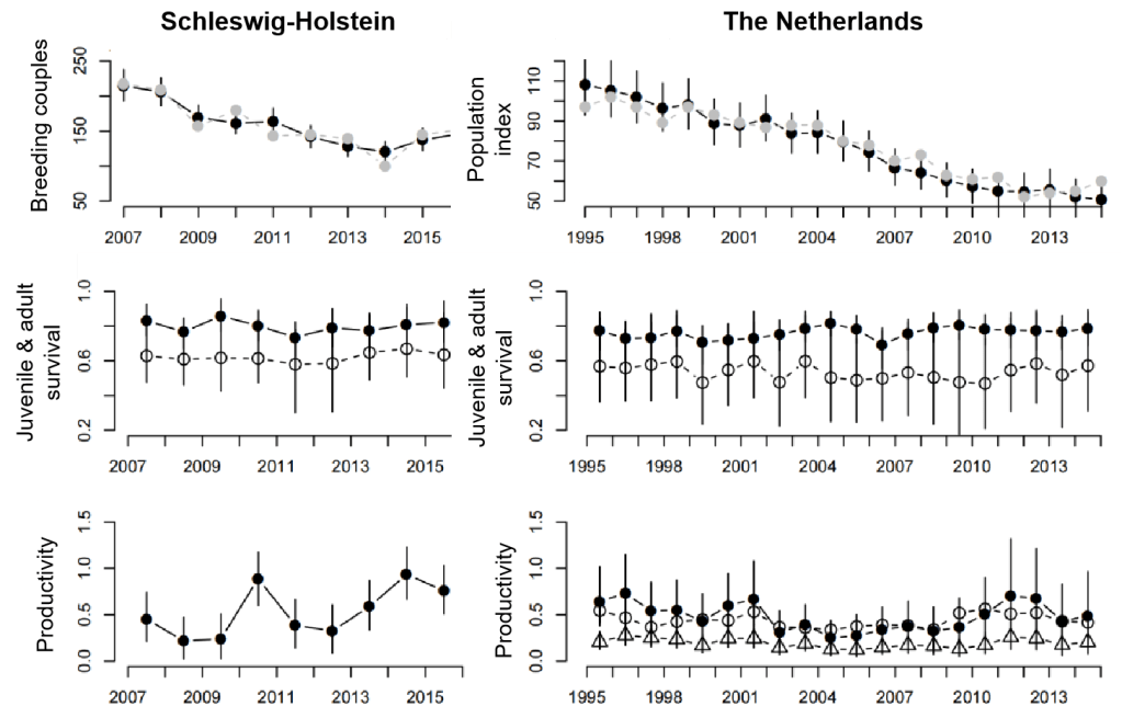 Taking advantage of monitoring data from the populations of lapwings in the Netherlands (NL) and one region in Germany [Schleswig-Holstein (SH)], I built two integrated population models describing the dynamics of these two subpopulations. Each monitored subpopulation combined survival data, reproductive data and count data: monitoring of nests, count of breeding couples, recapture of ringed birds… Despite the spatial and temporal heterogeneity of the data, the results obtained from the two integrated population models showed similar mean demographic parameters (survival, productivity) between the subpopulations.