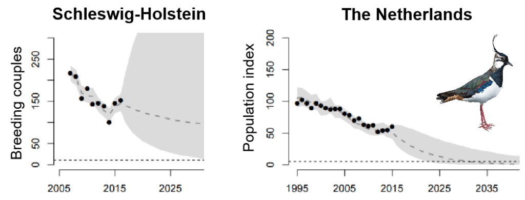 The Northern lapwing vanellus vanellus is a good illustration of the recent strong decline of waders in Europe. While it used to be a common agricultural bird up to the 1980s, this bird has obtained the status Near-Threatened since 2015. This migratory species spends its winters in South-West Europe and in North Africa where it is hunted. However, a study suggested that hunting was not the main driver of population decline. In some breeding populations, costly protective measures have been implemented and aim for direct protection of lapwing nests. A robust analysis was thus needed to assess if these measures were sufficient for halting the population decline at large spatial scales. A group of researchers from the Netherlands, Germany and Switzerland working on wader populations called on me to complete this analysis.