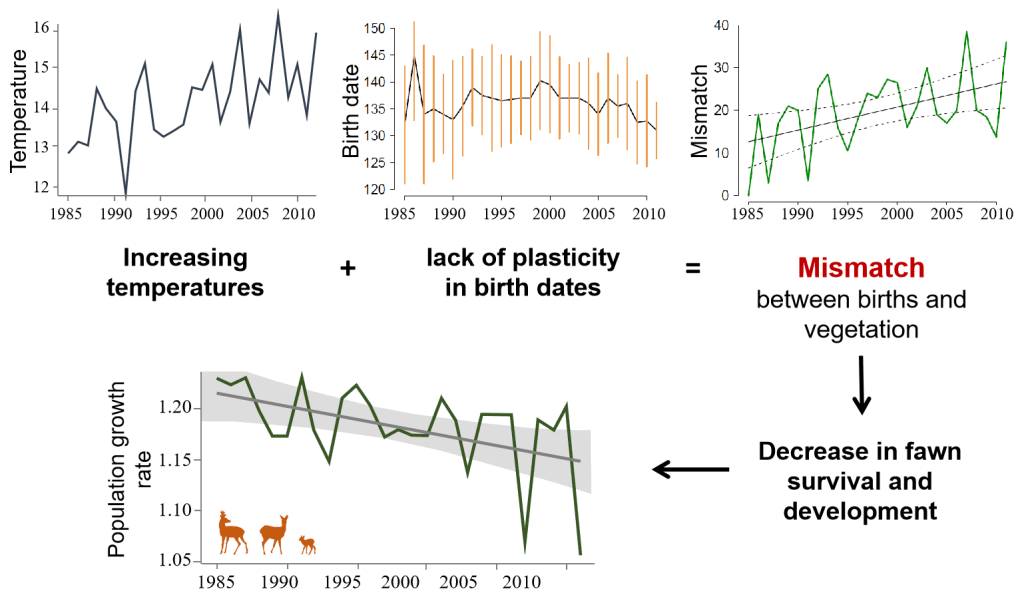 Climate change has led to an advance in spring phenology. Therefore, the period when the vegetation is easily digestible and provides the highest energetic food for roe deer has advanced over years. In contrast, the period of fawn births has not changed. I found that the decrease in fawn survival was due to a higher mortality among fawns born relatively late during the birth season. Indeed, these late fawns suffered from an increasingly late birth date compared to the peak of abundance of quality resources. This decrease in fawn survival and development has resulted in a 6% reduction in the population growth rate over 25 years.