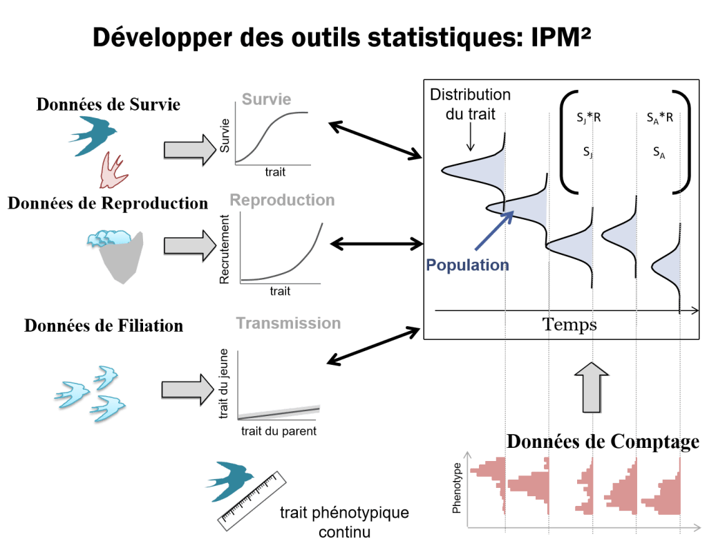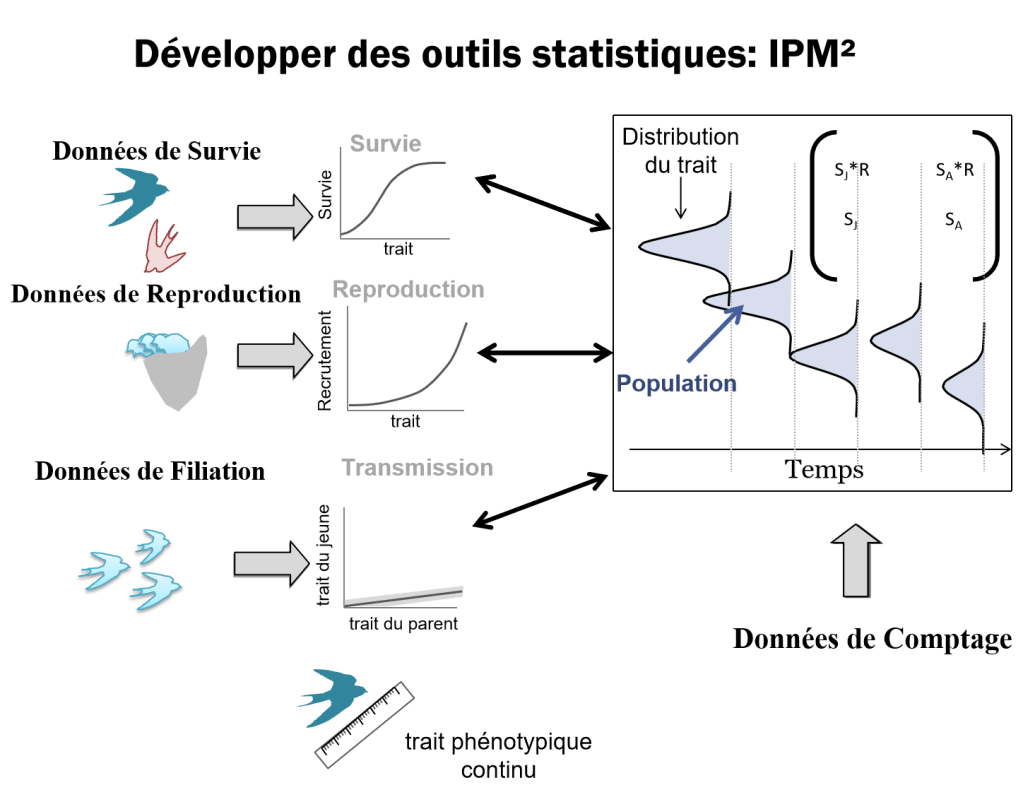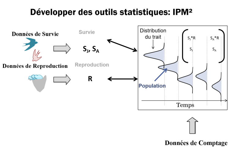 La relation entre performances individuelles chaque année, et attributs de naissance et environnement peut être faite par le biais des attributs individuels dynamiques. J’utilise donc des traits phénotypiques dynamiques tels que la masse corporelle ou la phénologie de reproduction, qui reflètent la condition annuelle des individus, pour pouvoir prédire l’hétérogénéité des performances individuelles dans une population. Ces traits dynamiques me permettent de développer des modèles de dynamique de populations qui, en modélisant la dynamique des individus et de leurs différences, permettent de mieux prédire les réponses des populations aux changements environnementaux.
