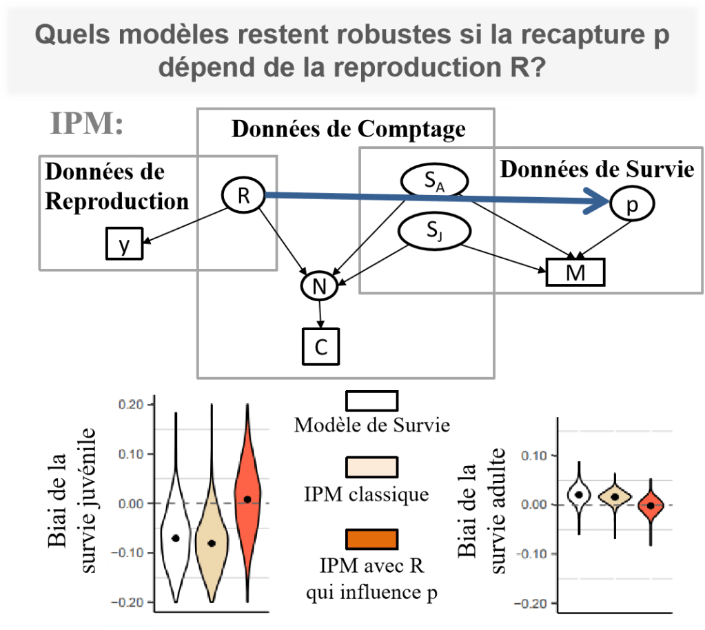 Le facteur limitant pour répondre à des problématiques de gestion et de conservation est souvent la quantité et la qualité des données et notre connaissance limitée de la population. Les suivis de populations, et en particulier de celles en déclin, sont souvent récents et concernent peu d’individus. Il faut parfois s’accommoder de données opportunistes qui sont les seules disponibles. A l’inverse, les modèles de dynamique de population ont été développés pour obtenir des résultats à partir de données collectées de façon rigoureuse, sur un nombre suffisants d’individus au cours de plusieurs décennies. J’étudie donc la robustesse des modèles de dynamique de populations pour comprendre quelles sont leurs limites; dans quels contextes, avec quelles hypothèses et avec quelles données pouvons-nous les utiliser? J’évalue quelle doit être la complexité d’un modèle pour donner des résultats robustes. Je combine différents types de données pour obtenir des résultats robustes et utiles en fonction de la question posée.