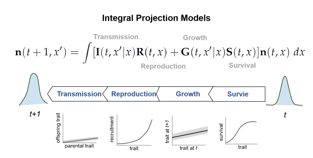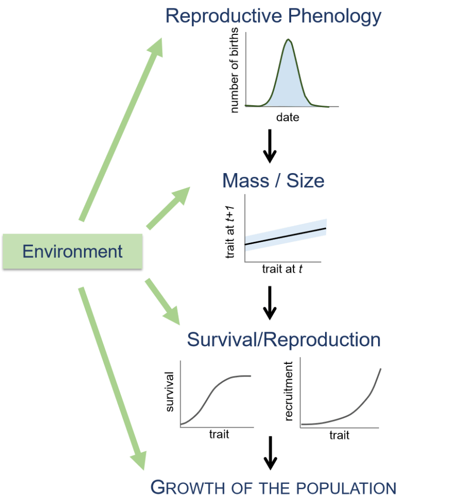 The relationships between annual individual performance, and birth attributes and environmental conditions can be made through dynamic individual traits. I therefore use dynamic phenotypic traits such as body mass or reproductive phenology, which reflect individual annual condition, to be able to model individual heterogeneity in performance. These dynamic phenotypic traits allow me to develop models of population dynamics which, by modeling the dynamics of individual heterogeneity, permit me to predict the responses of populations to environmental changes.